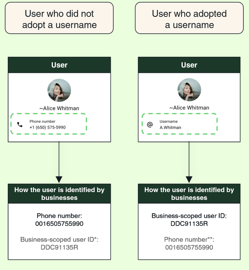 With WhatsApp usernames, phone numbers may not be available for all users. Ensure your system supports both identifiers for outbound messaging.
